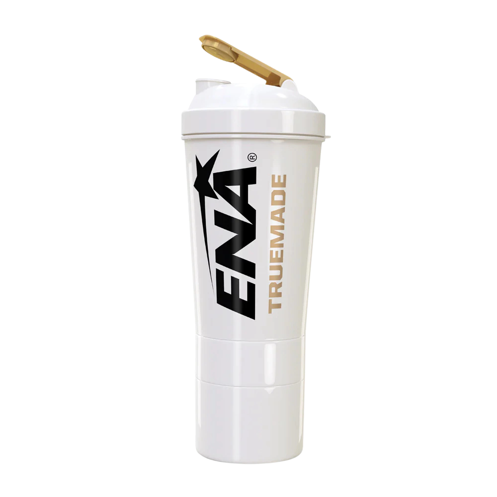 Shaker Plus de ENA es un agitador avanzado con compartimientos integrados para transportar dosis adicionales de proteína o suplementos, ideal para deportistas que necesitan tomar múltiples suplementos durante el día.