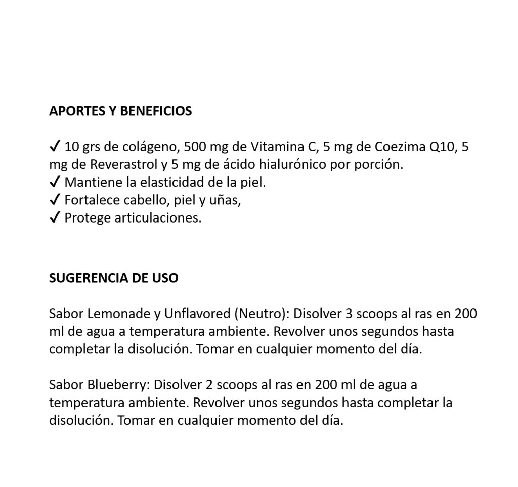 Modo de uso: Mezclar 1 scoop (10g) con 200ml de agua fría, jugo o tu bebida preferida. Consumir una vez al día, preferentemente por la mañana en ayunas o antes de dormir para máxima absorción.