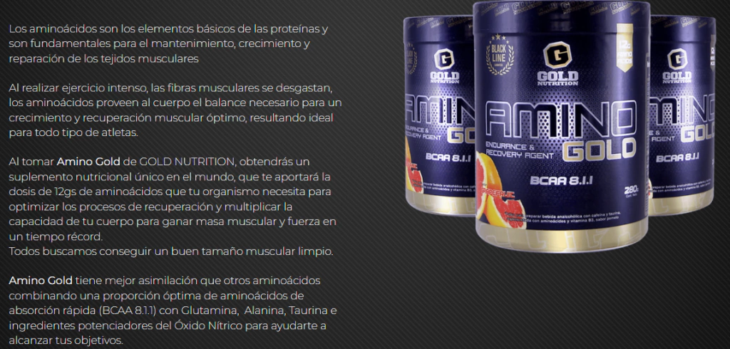 Amino Gold de GOLD NUTRITION es una avanzada fórmula de aminoácidos de cadena ramificada (BCAAs) enriquecida con L-Glutamina y electrolitos, diseñada para maximizar el rendimiento durante el entrenamiento y acelerar la recuperación muscular.