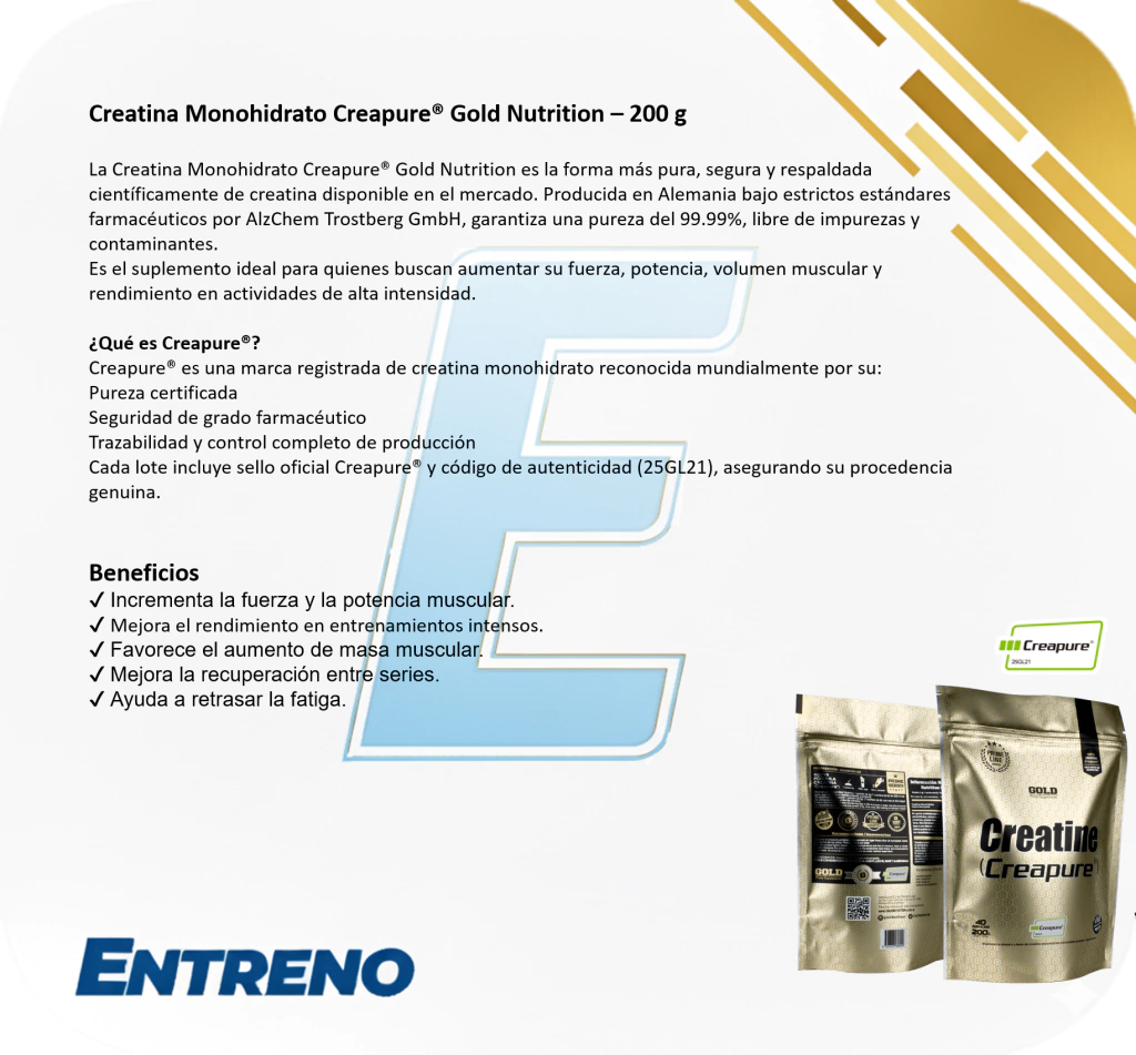 GOLD NUTRITION Creatine CREAPURE 200 Gramos La Creatina Monohidrato Creapure® de Gold Nutrition es el suplemento definitivo para quienes buscan maximizar su fuerza, potencia y volumen muscular. Elaborada en Alemania bajo estrictos estándares farmacéuticos por AlzChem Trostberg GmbH, esta creatina garantiza una pureza excepcional del 99.99%, libre de impurezas y contaminantes, lo que la convierte en la opción más segura y efectiva del mercado.