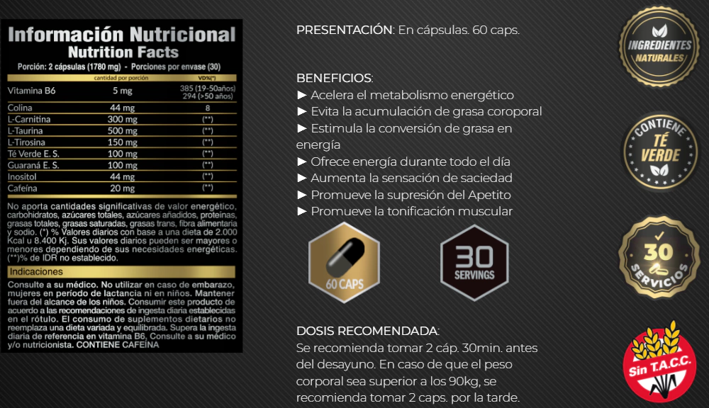 Modo de uso: Debido a su alta concentración, comenzar con 1 cápsula antes del desayuno para evaluar tolerancia. Luego aumentar a 1 cápsula antes del desayuno y 1 cápsula antes del almuerzo o entrenamiento. No exceder las 2 cápsulas diarias. Evitar el consumo después de las 3 PM.